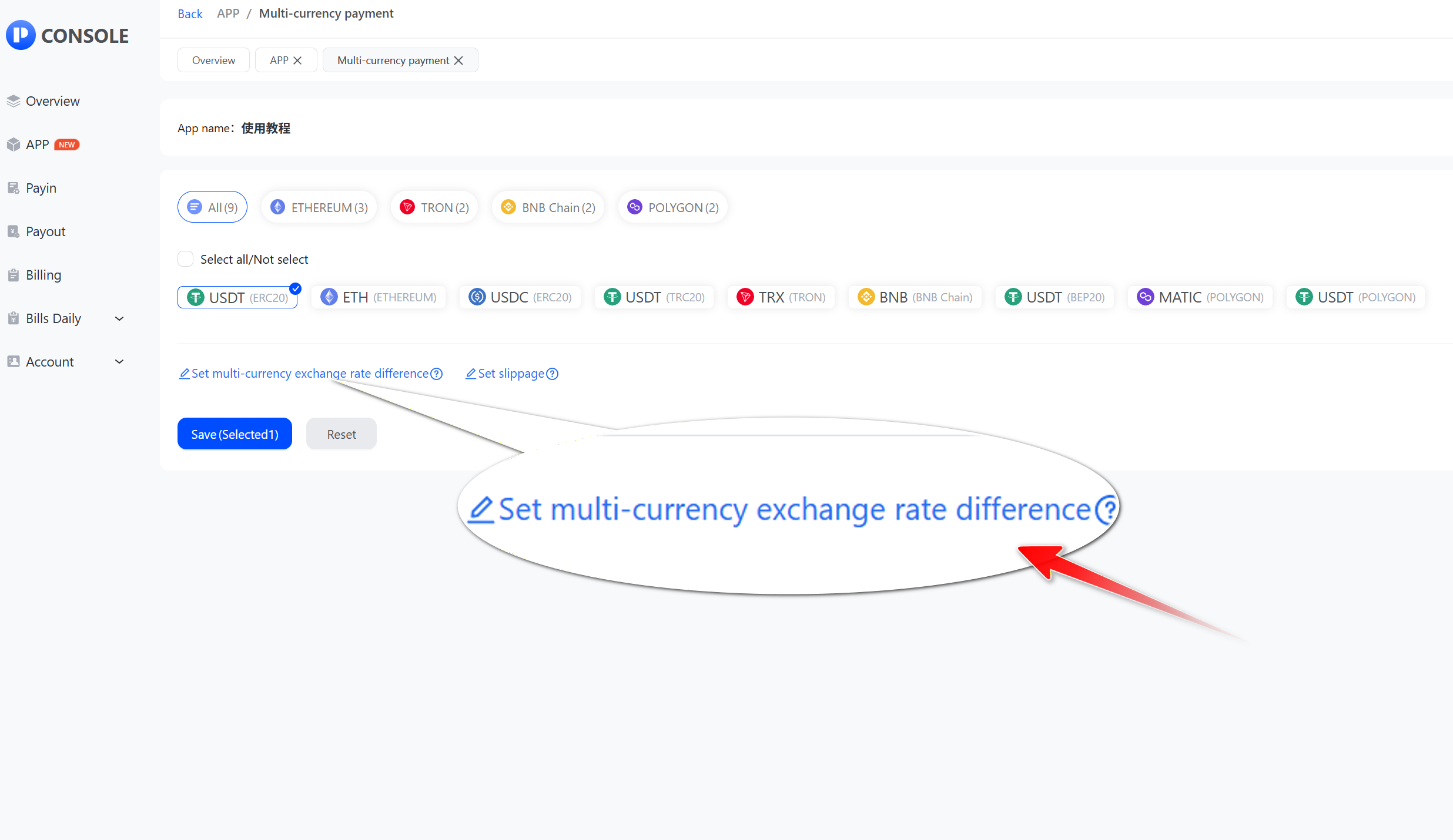 - Click “App” and then ‘View’ to access the app list. Select the API app you want to configure, click “Set Currency,” go to the multi-currency payment page, click “Set multi-currency exchange rate difference”.