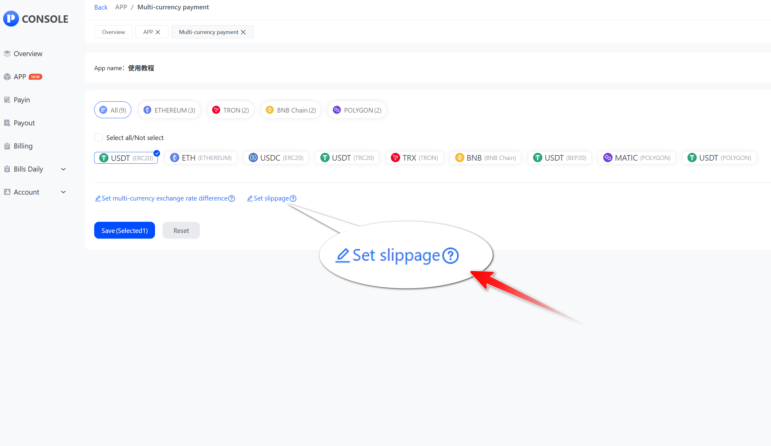 - Click “App” and then ‘View’ to access the app list. Select the API app you want to configure, click “Set Currency,” go to the multi-currency payment page, and Click “Set slippage”.