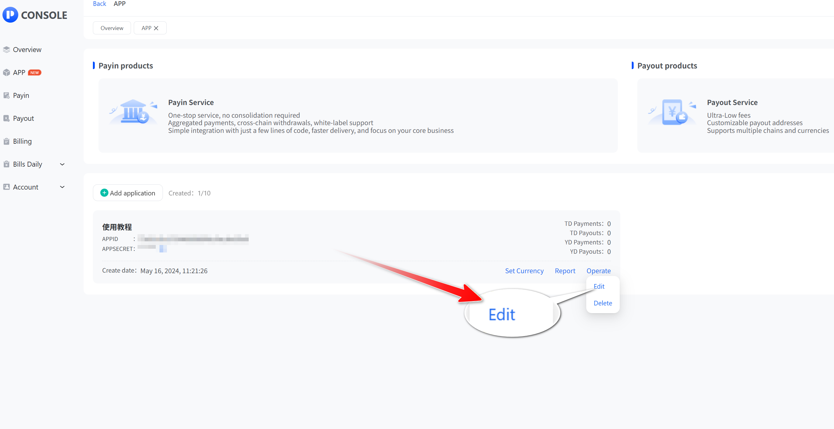 - Click “App” and then “View” to open the app list, select the API application you want to set, click "Operate", then click "Edit".