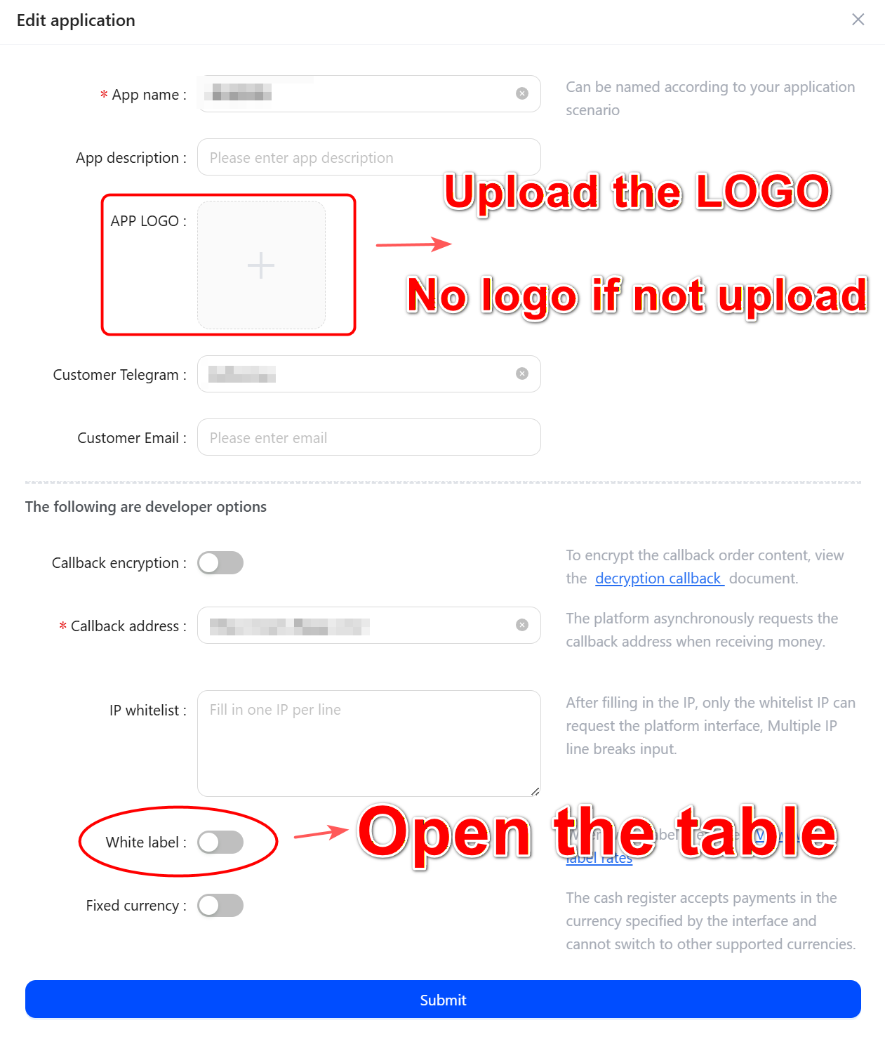 - Open the White Label Table, upload a customized logo (no logo if you don't upload it), and click submit!