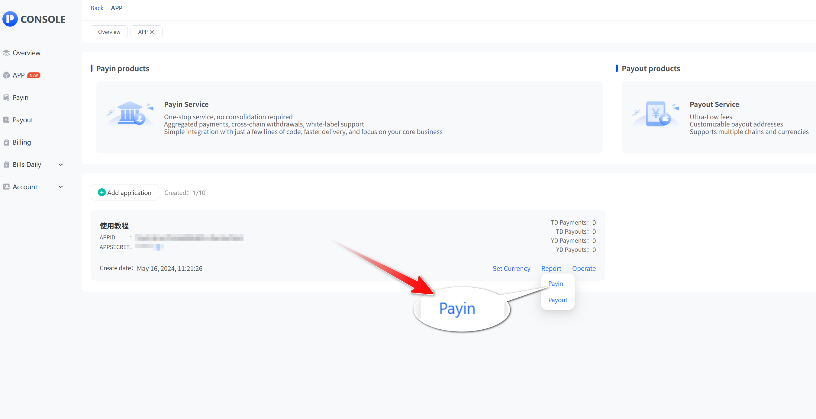 - Click “App” and then ‘View’ to access the app list. Select the API application that you want to view the Payin report and click "Payin".