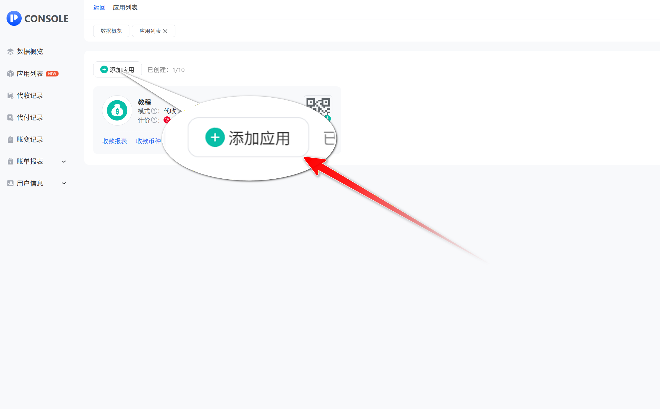 - 创建成功后,我们可以看到新添加的应用二维码。再设置二维码收款模式、钱包地址、币种就可以使用了。