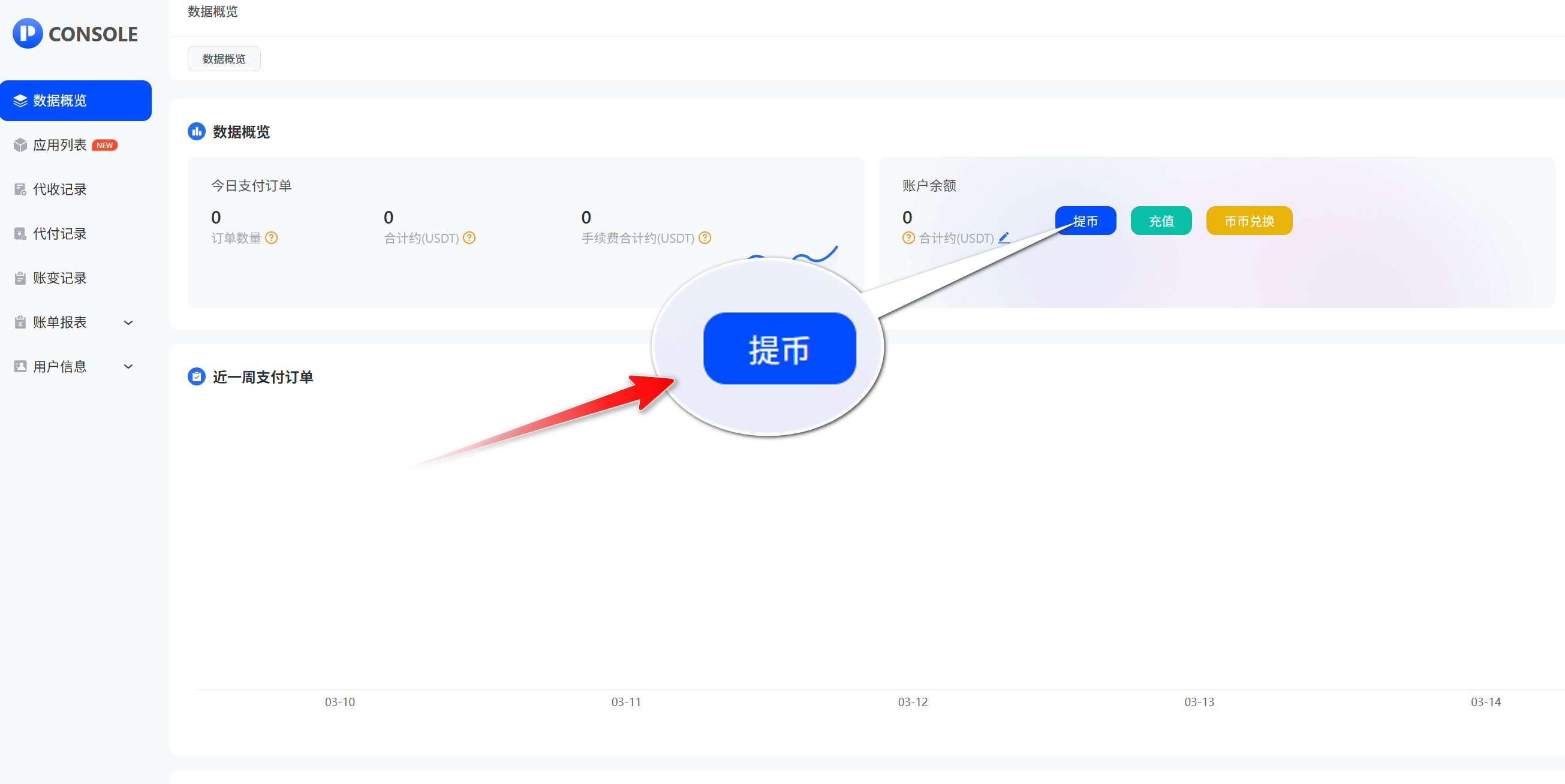 【商户】如何提币?发布时间:2026-03-16 08:19提币是从平台中将数字货币资产转移至外部钱包地址的操作。提币操作需要用户谨慎核对目标地址及相关信息,确保资产安全。同时,提币可能会收取一定的手续费,用户需要注意相关费用。数据概览,点击“提币”选择币种,输入钱包地址,填写提币金额,点击“立即提币”注意事项:如果Tron 链地址,未激活不允许提现提币24小时内到账